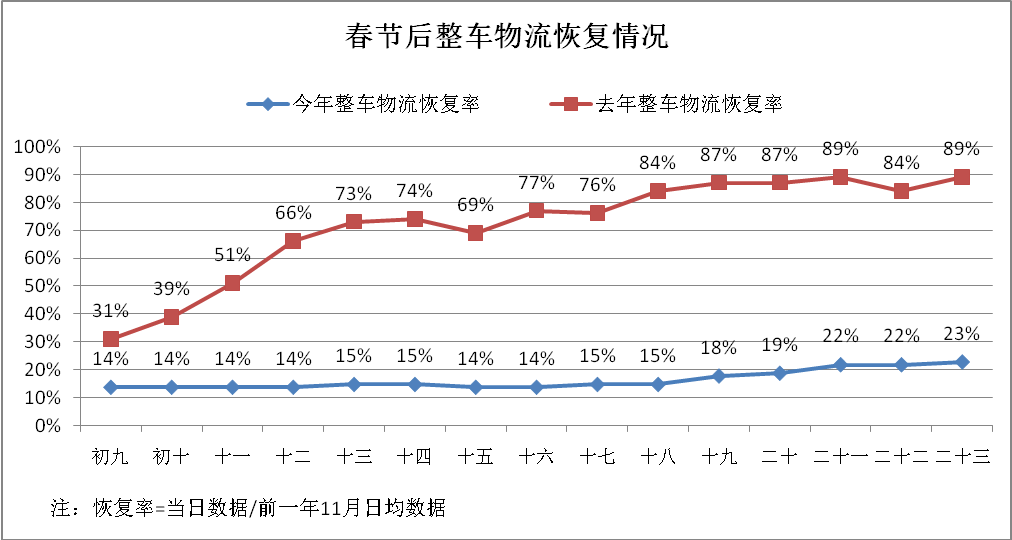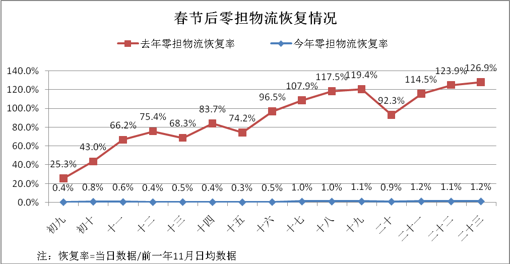 从细分市场看,快递包裹运输恢复较为稳定。整车运输大量为合同运输、快递外协以及大宗商品运输,大数据显示,受其他行业复工复产进度影响,整车运输车辆恢复率为往年的四分之一。零担运输整体恢复率不到往年的5%,除部分规模型零担快运企业外,大部分零担货运市场和中小零担专线企业受各种因素影响还没有开门营业。由于零担货运市场没有开门,为大量中小制造商贸企业提供业务配套和小批量运输的零担业务无法开展,部分企业为保障生产不得不采取价格更高的包车运输,大大提高了社会物流成本。