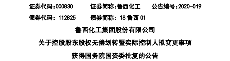 4月22日,鲁西化工发布公告:4月21日收到控股股东鲁西集团的通知,国务院国资委向中化集团核发了《关于鲁西集团有限公司国有股权无偿划转有关事项的批复》(国资产权[2020]150号),批准同意本次划转。