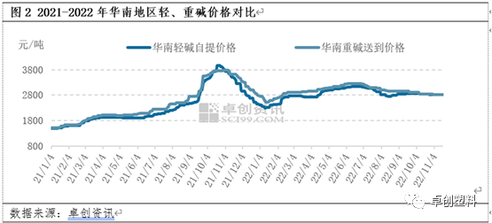 以华中、华南地区为例,2022年9-10月份当地轻、重碱价格再次出现倒挂现象。2021-2022年华中地区轻、重碱价差多数时间维持在100-250元/吨,经测算,华中地轻碱、重碱价格的相关系数在0.94。2022年9月轻碱下游适度补库,轻碱出货情况好转,市场价格止跌企稳,但重碱价格受下游压制,仍有所下滑,华中地区轻、重碱价差不断收窄,并且从终端价格来看,轻、重碱终端价格出现倒挂,幅度评估在50元/吨左右。