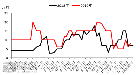 进入2019年下半年镇江港港口库存数据由高走低,最高至20万吨,最低至4万吨。截止12月20日,磷酸二铵国内主要港口库存量约22.1万吨,较上周减少5.6万吨。其中镇江港减少4万吨至4万吨,防城港减少0.5万吨,北海港减少1.1万吨,其他港口暂无变化。主因国际主要进口国库存高位,进口需求差,加上中国港口离岸价不断走低,企业出口积极性欠佳,企业重心转向冬储市场,致使港口库存走低。