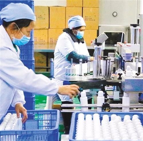 2月12日,江西省樟树市正康医药公司员工在酒精罐装线忙生产。公司在政府帮扶下解决了原料短缺困难,有力保障了抗疫物资供应。陈晗摄(中经视觉)