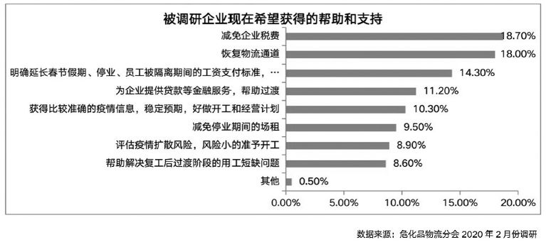 调研结果显示,被调研企业中,最希望获得的帮助和支持是减免企业税费和恢复物流通道,分别占比18.7%和18%。排在第三的是明确延长春节假期、停业、员工被隔离期间的工资支付标准,视情给予补贴。调研企业还提出了其他六方面的意见和建议,包括在保障安全的前提下,推进行业内资源共享,同类产品集中配送等应对措施,让产品尽可能送达下游客户处;统一湖北以外的各地区的的交通管制措施等。