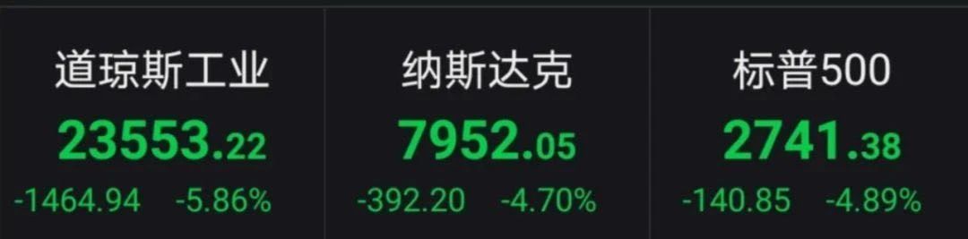三大指数一度均进入“技术性熊市”区间。至收盘时,道琼斯工业指数收于23553.22点,下跌5.86%;标准普尔500指数收于2741.38点,下跌4.89%;纳斯达克指数收于7952.05点,下跌4.70%。