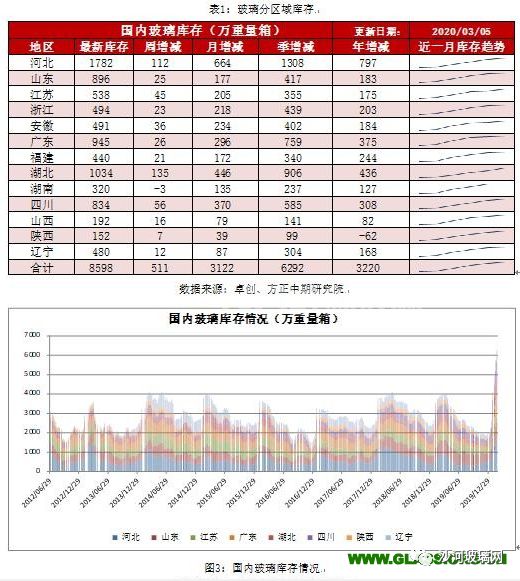 2020年玻璃产能变化情况:天津信义一线1000吨放水冷修;重庆渝虎二线前期点火之后已经正常生产;前期计划点火的福建新福兴二线900吨时间延后;江西宏宇能源一线700吨熔窑到期,放水冷修。江西宏宇能源发展有限公司白玻700t/d宏宇一线,于3月5日放水冷修。河北海生600t/d海生一线原产福特蓝,于3月4日下午投料改产蓝灰。