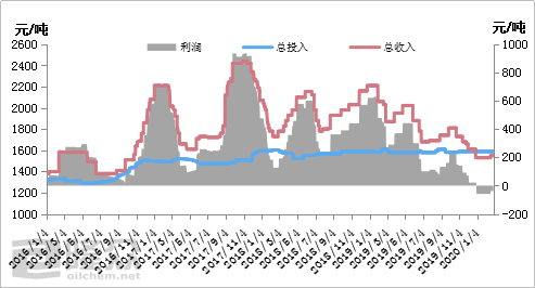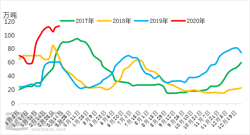 从库存变化走势看,纯碱库存涨跌变化明显。春节期间,纯碱库存表现增加,上涨速度快且高,主要原因在于下游需求停止,物流运输受限,碱厂生产正常,产量滞留于库,导致节后纯碱库存高。春节过后,下游装置和交通运输等需要一段时间恢复,在此期间,纯碱企业出货难有太大提振,库存持续稳中有升。2020年,截止到3月中旬库存110万吨以上,创历年新高,受卫生事件影响,下游复工和运输推迟,导致企业库存持续累计。此外,2019年纯碱产能的投放,对于2020的年供应增加。