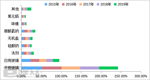 纯碱的作为无机化工品,应用广泛。通过对下游主要领域的未来发展分析,需求面变化并不是很大,从目前的市场信息看,多个领域处于饱和状态,未来产能增加有限。从2015-2019年纯碱需求结构变化趋势图中看出,纯碱下游主要包括平板玻璃、日用玻璃、洗剂、碳酸钠、无机盐、碳酸氢钠、味精、氧化铝以及其他,其中平板玻璃和日用玻璃占据的比重较大,两者占比在60%左右,需求相对稳定。