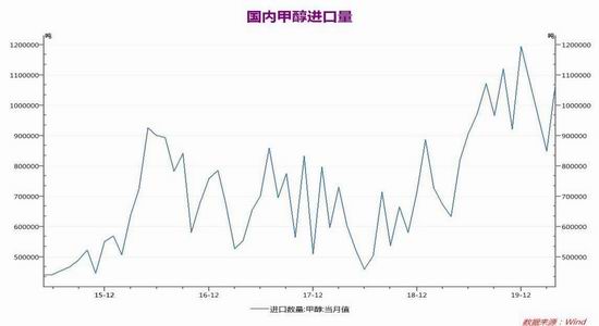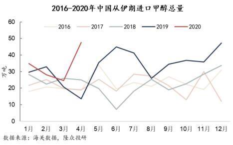 进口方面,每年一季度是外盘装置检修高峰期,因而甲醇进口量处于季节性低点,但随着近年来外盘装置陆续投产,今年一季度我国甲醇进口量同比仍然增加。今年1—2月,我国甲醇进口量为172万吨,同比增加6.2%。进入二季度,受伊朗甲醇新装置投产及全球疫情影响下,海外市场需求偏弱,外盘货源发往中国进行套利意愿增加,进口量持续走高。据隆众资讯统计,2020年5月进口船货抵港量预计114.99万吨,较4月份海关数据进口量(107.38万吨)增量7.61万吨,增幅7.09%,国内甲醇进口量继续向上突破,月内进口船货原定计划接近130万吨,但在港口罐容紧张的压力下,主流库区卸货压力增大,卸货速度缓慢,使得进口未及预期,但仍维持增量,达到2020年最高水平。6月份进口量预估仍将维持在100万吨以上。