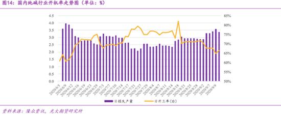 供应方面,进入9月以来纯碱企业装置意外不断。本周南方碱业、江苏井神等企业停车拖动纯碱行业日开机率降至64.74%,日损失量也一度达到3.57万吨。但随着江苏实联、陕西兴化等企业复产并逐步出产品,开机率周末有所回升。但目前纯碱行业整体开机率仍维持在67.24%的低位水平,同比降低23.92个百分点。预计纯碱供应水平短时间内难以快速恢复,供给缩减将给纯碱企业提价心态带来有效支撑。