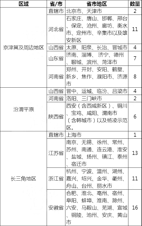 根据生态环境部发布的长三角地区和京津冀及汾渭平原的大气污染防治计划,涉及85个城市,名单如下: