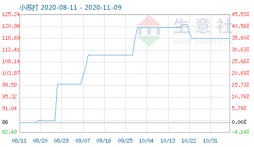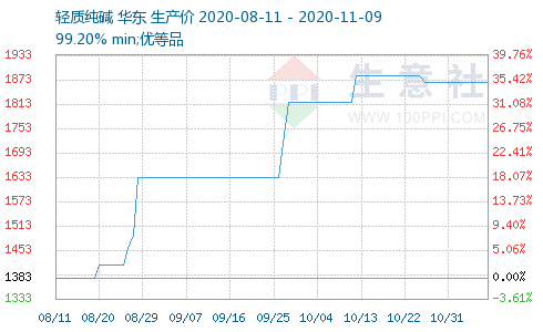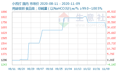 据生意社监测数据显示,国内小苏打价格下滑。11月9日国内市场均价为1690元/吨,11月8日国内市场均价为1656.67元/吨,价格下调3.8%。11月8日小苏打商品指数为116.59,与昨日持平,较周期内最高点121.68点(2020-10-21)下降了4.18%,较2020年09月06日最低点100.00点上涨了16.59%。(注:周期指2020-09-01至今)